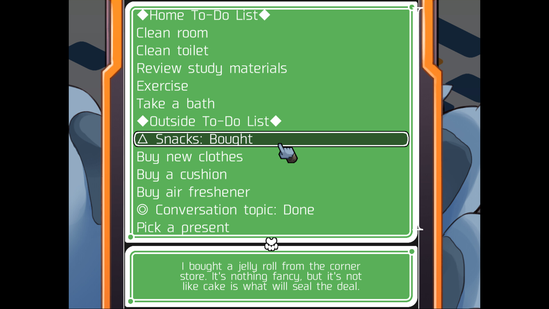 Also taking up his attention is his crush, and he has the perfect opportunity to impress her with their upcoming study date. Haruki's got a whole day to prep to make sure it goes perfectly, but he has a long list of things to do, and there'll be plenty of distractions along the way...