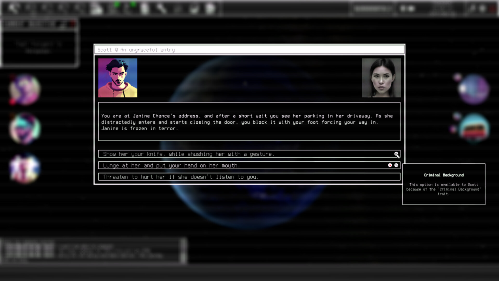 A single player hacking adventure set in the Untrusted world where you'll be playing as various hackers getting into computer systems to hack, steal and sabotage. Manage your crew, manage your risks, threaten or kill your targets. Investigate. Hack. Don't Die.