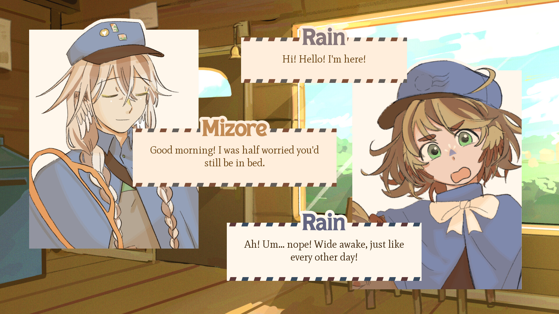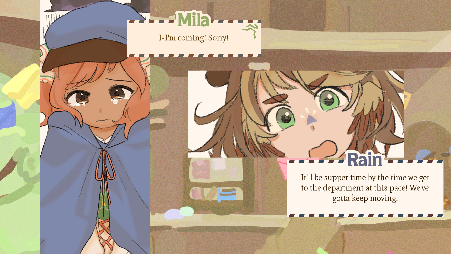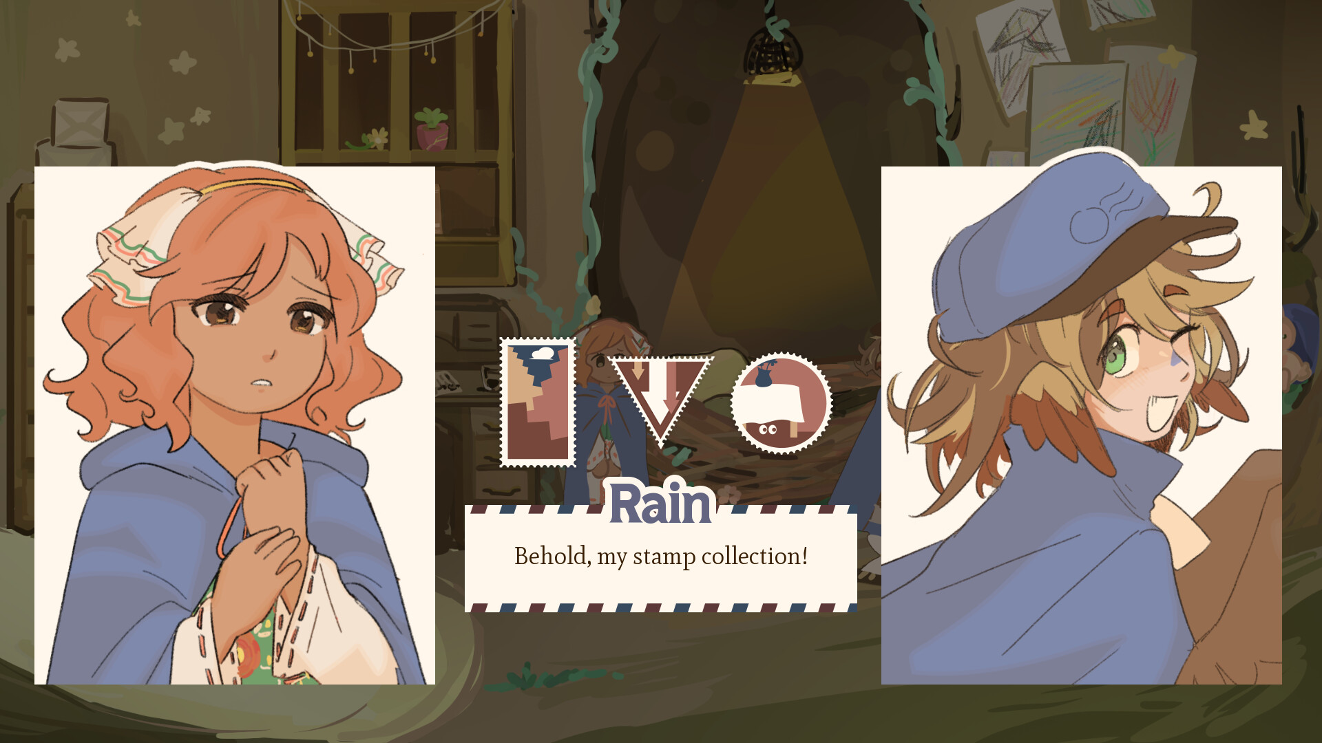 One part visual novel, one part puzzle adventure! Follow Rain and Mila through the mysterious Mortem Post as they meet with various couriers working throughout the tree and make use of Rain's trusty stamp collection to overcome a myriad of obstacles that stand in their way!