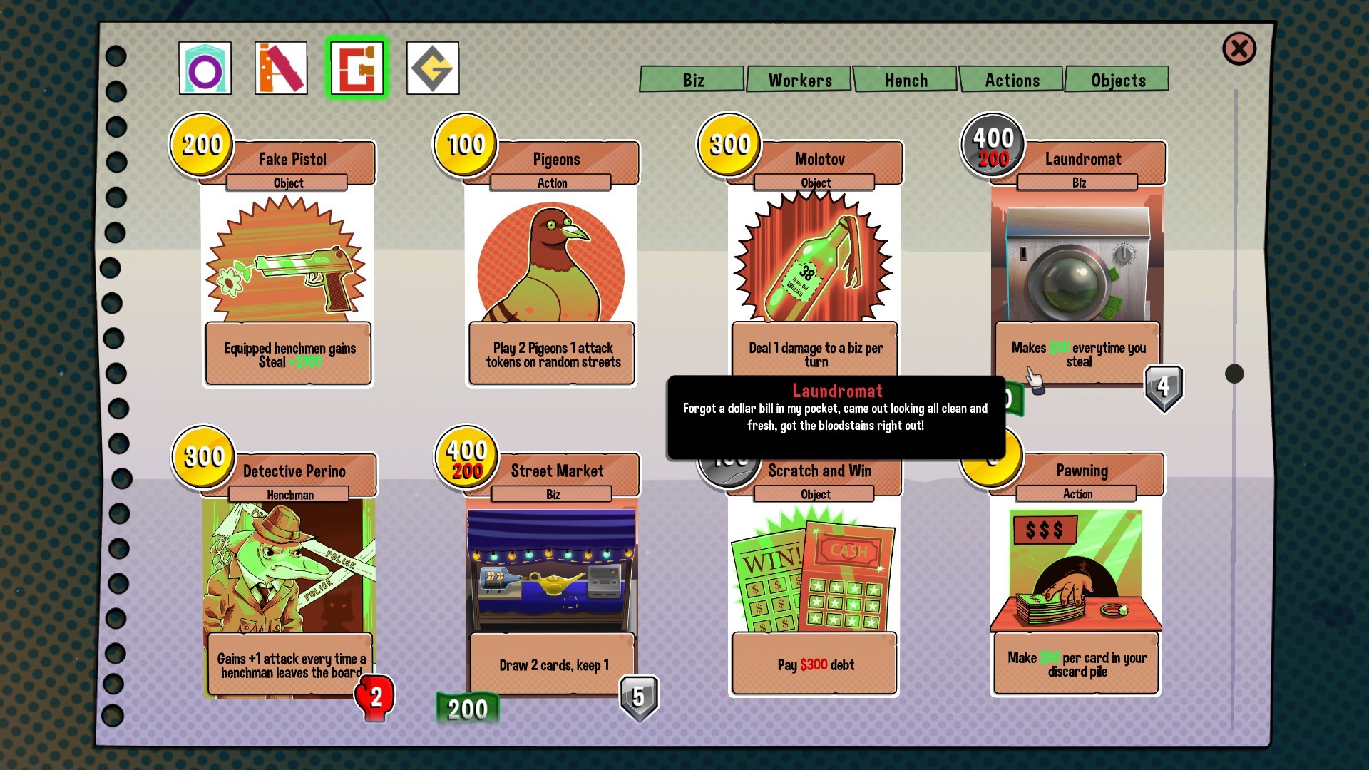 - Carefully manage the different types of cards at your disposal: Business, Workers, Henchmen, Actions, and Objects