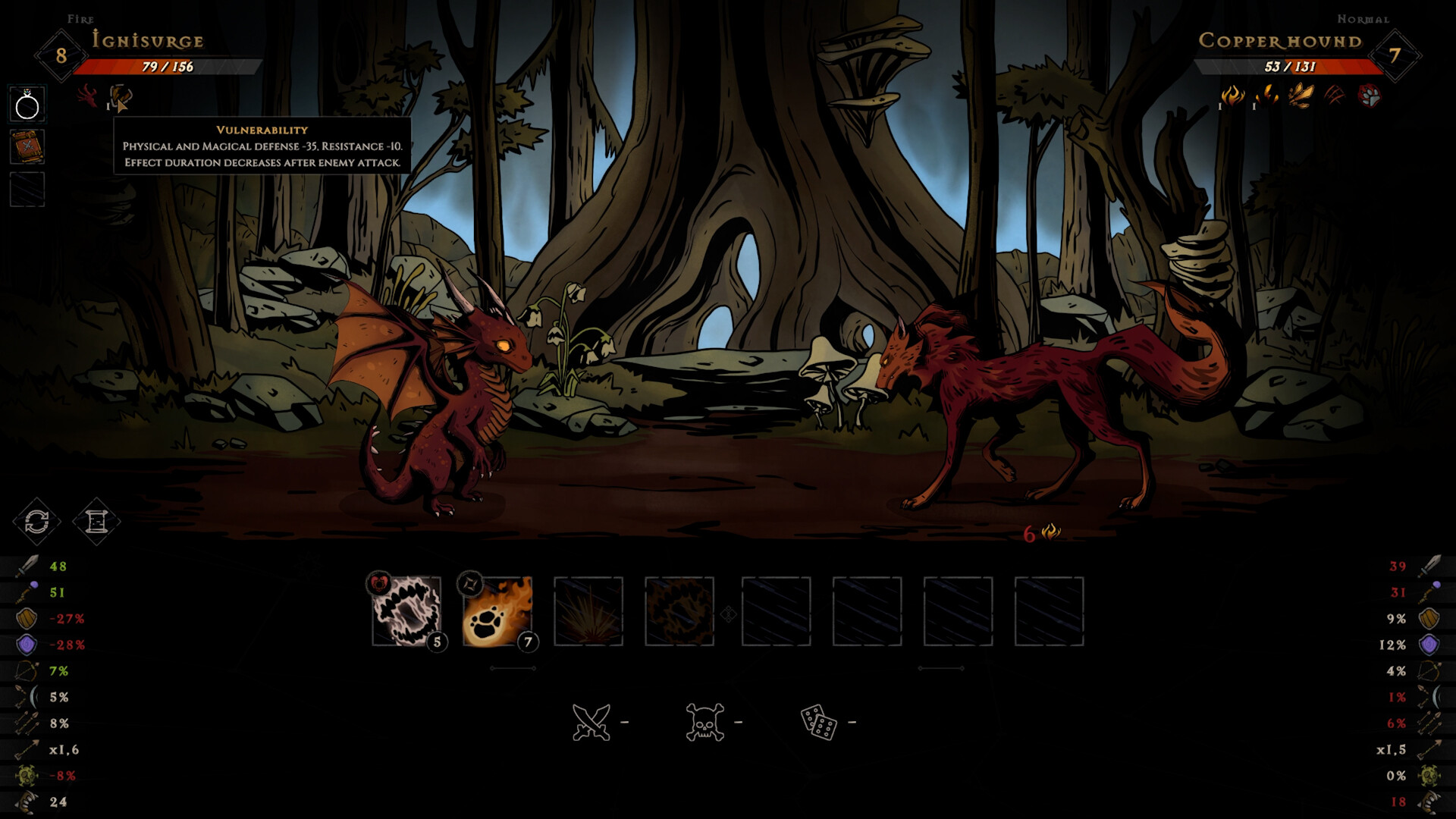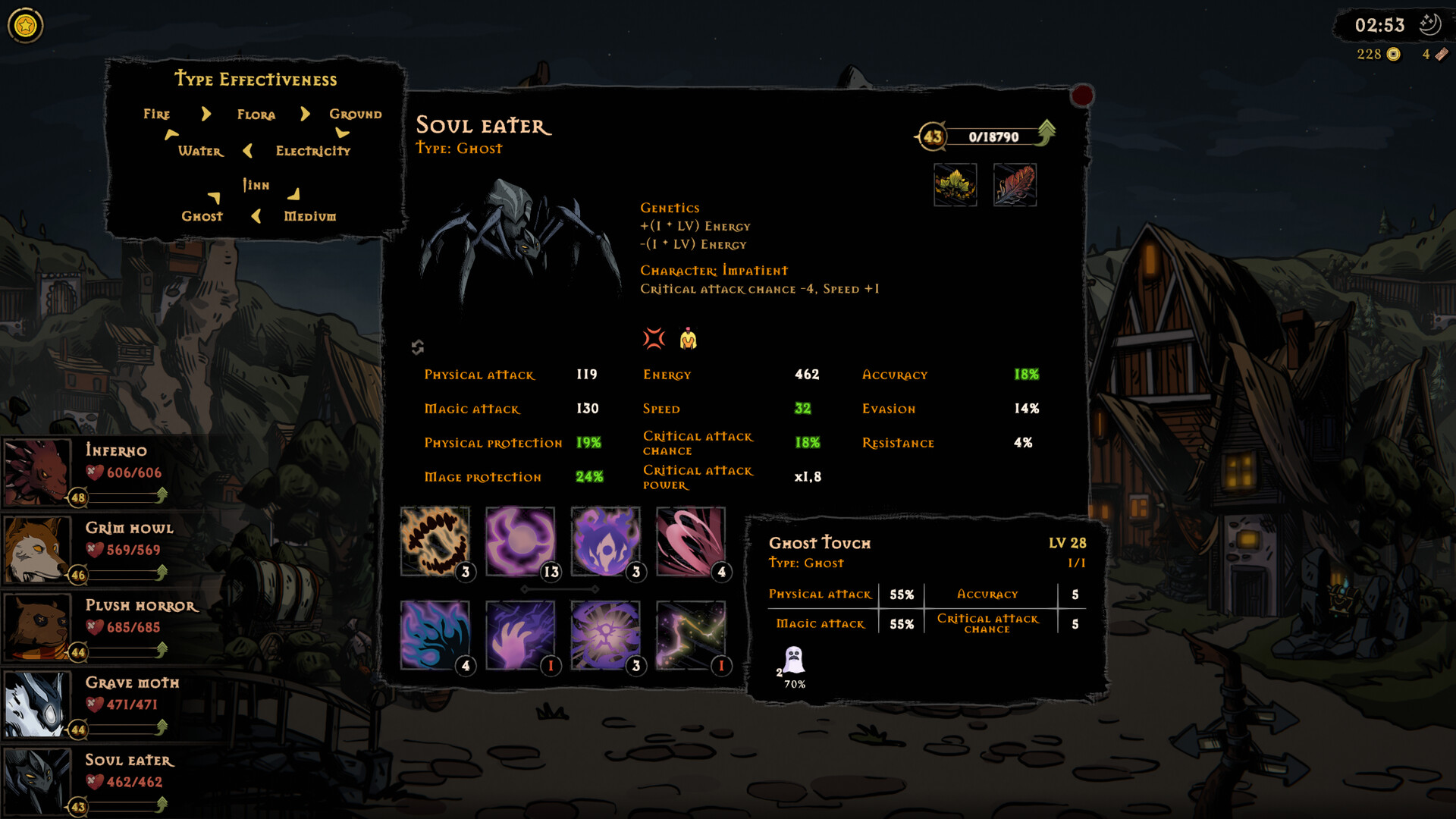 Challenging Turn-Based Combat: Monsters are one side of the coin. The other is a large catalog of attack moves, effects, passives, combined with an easy to understand type system. Grass is beaten by fire, but fire is beaten by water - and it doesn't affect just damage dealt, but can dramatically change the course of battle. Strategic thinking and creative tactics are essential to victory.