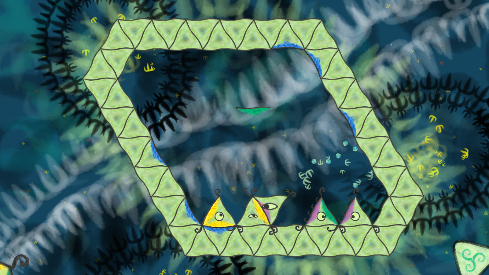 Volvox is a game richly filled with triangles, eyes, and curls, which appear constantly in various forms in characters, controls, and backgrounds, for a strongly organic aesthetic. The game's visual style comes from watercolor painting, and this art style consciously alludes to cellular diffusion phenomena. In addition to the advanced mode mentioned above, completing the game for the first time unlocks new options to change the backgrounds in 16 variants, altering your perception of Volvox while experimenting with the second mode.