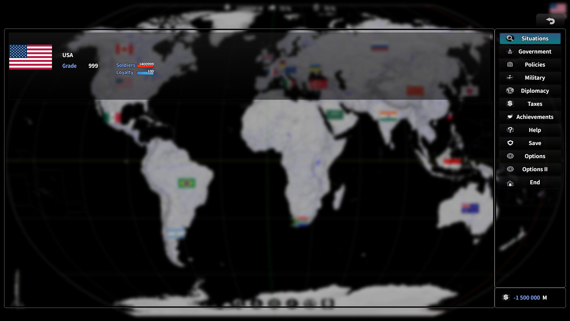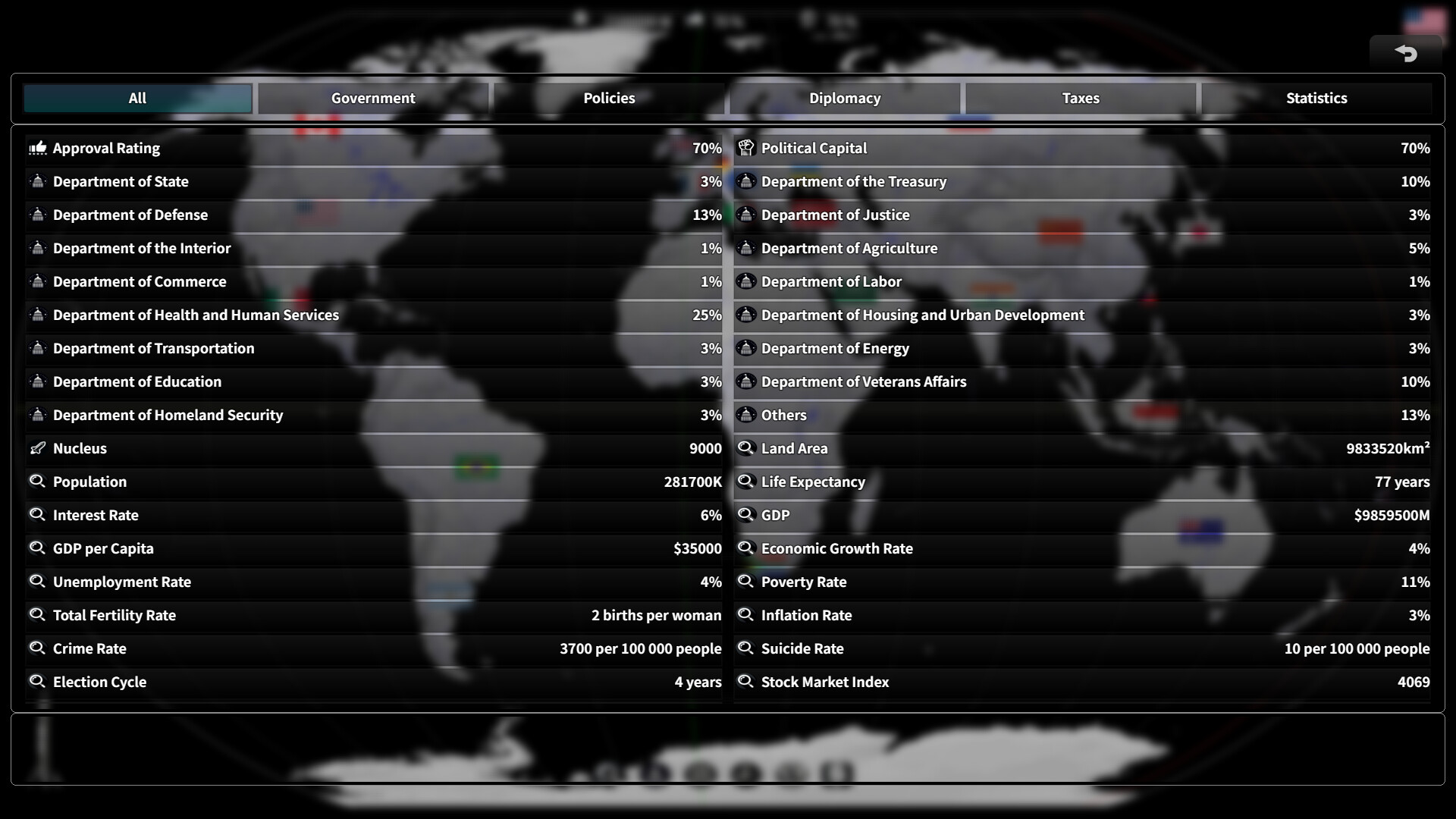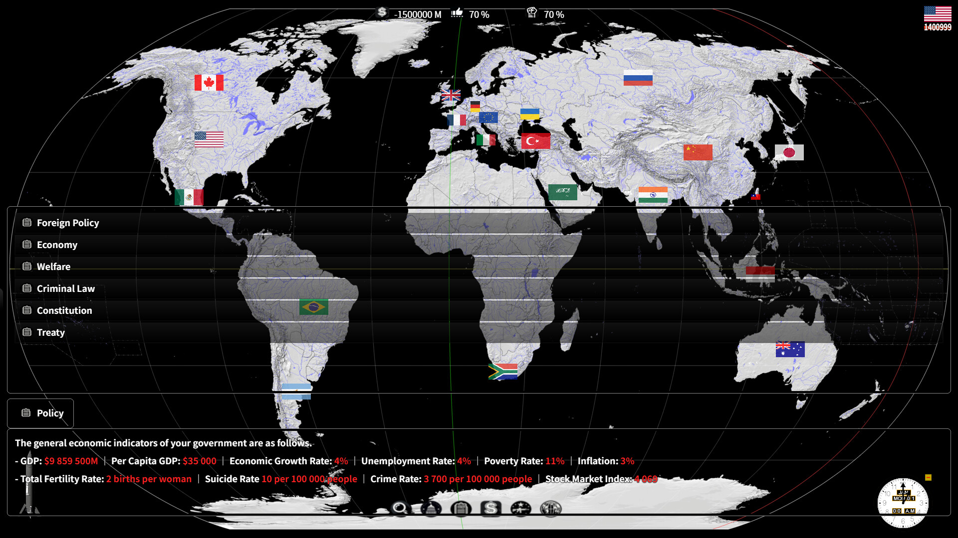 Take on the role of President (or Prime Minister) and manage the government, policy, taxes, military, and diplomacy.
