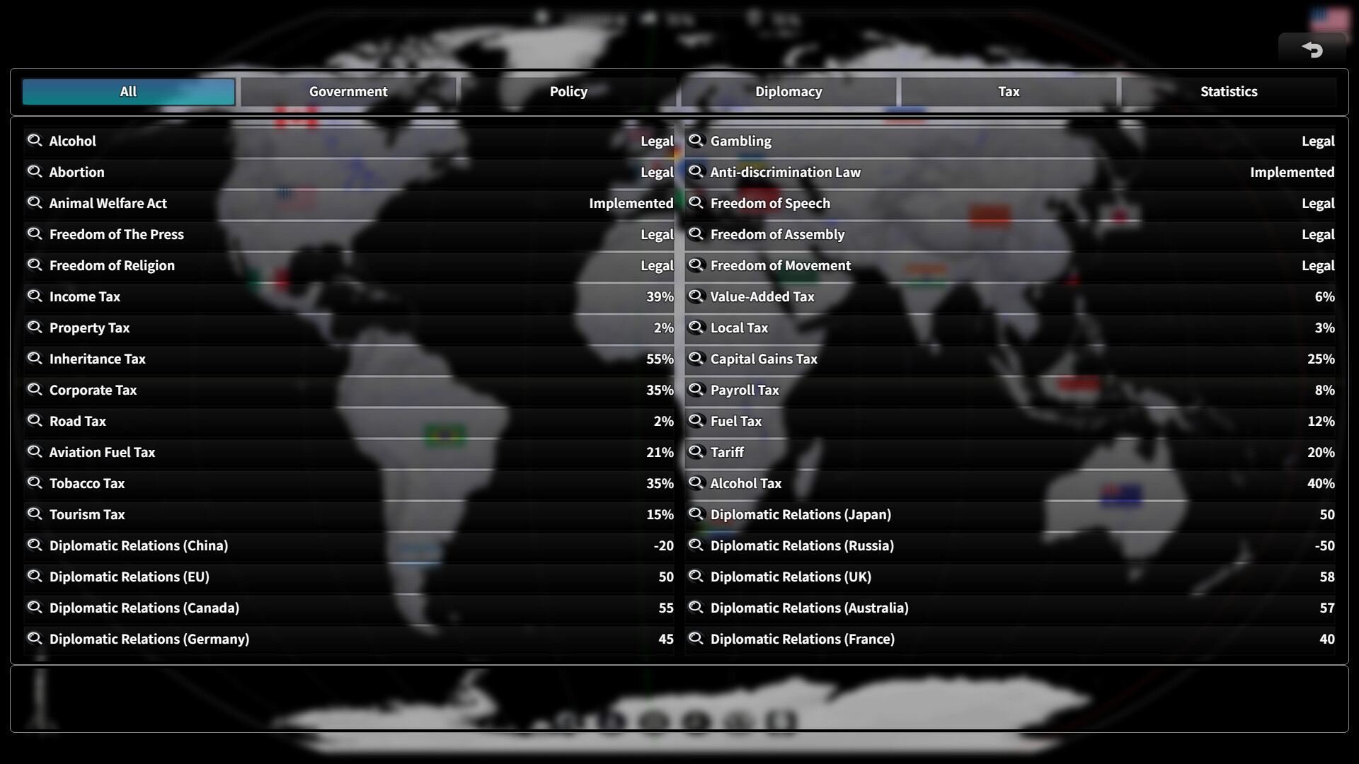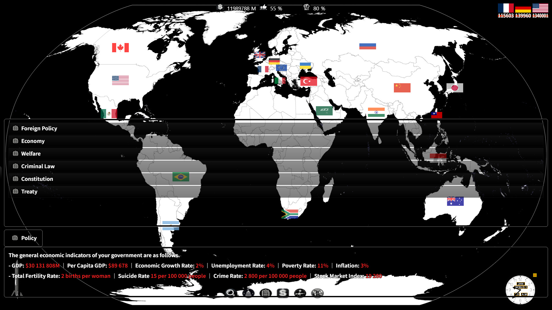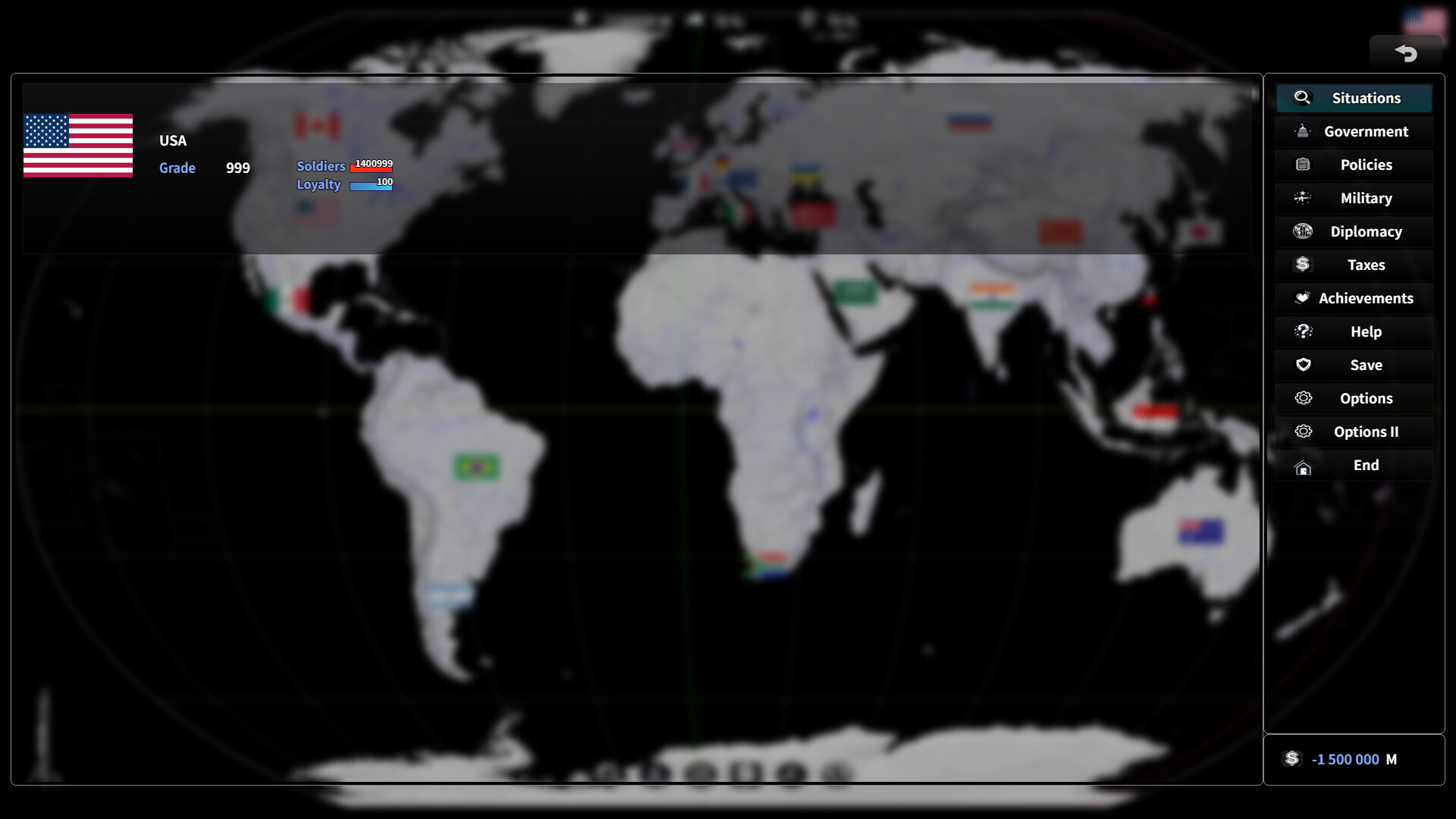 Take on the role of President (or Prime Minister) and manage the government, policy, taxes, military, and diplomacy.