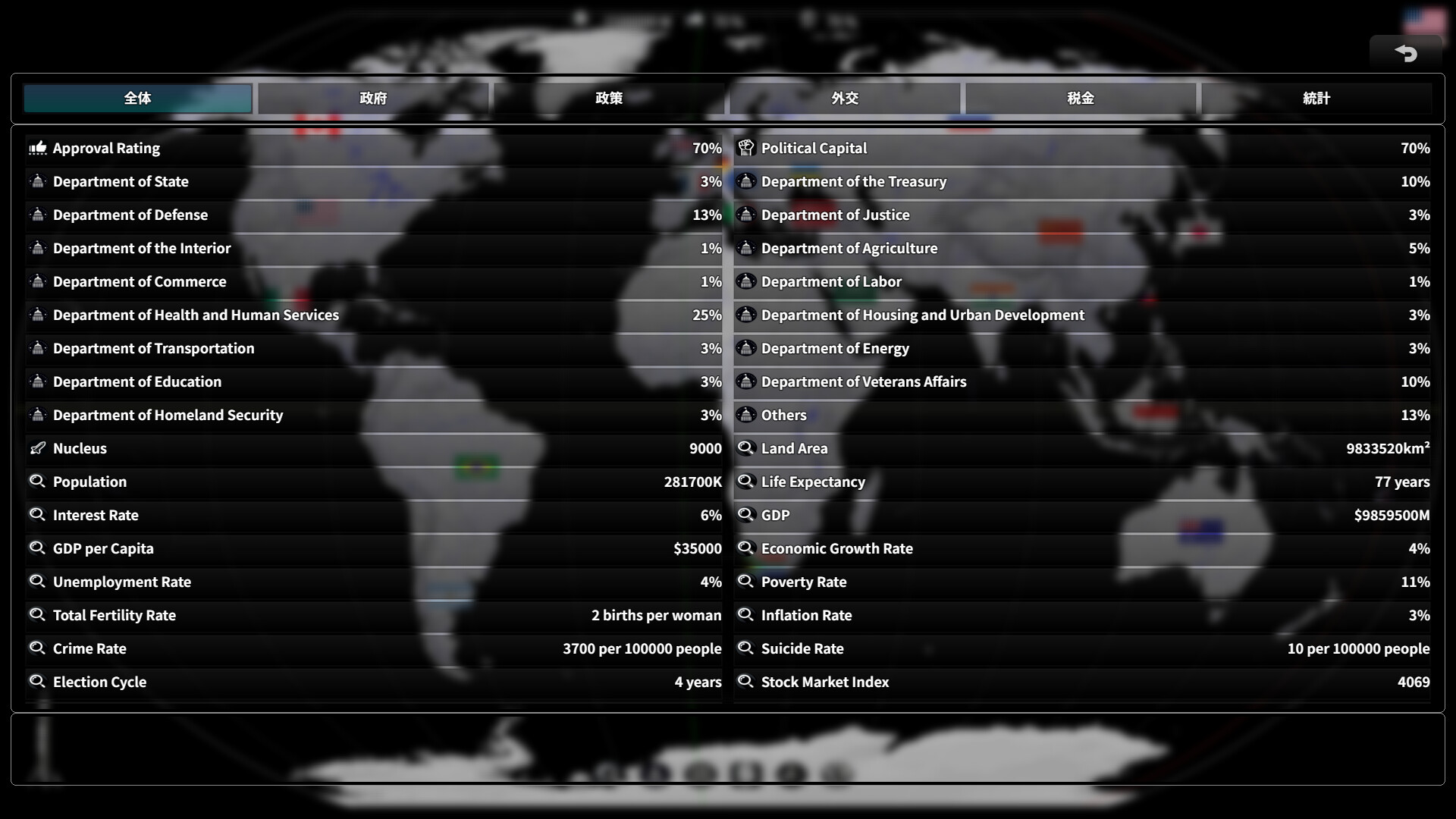 A strategy simulation that combines elements of war and politics. Take on the role of President (or Prime Minister) and manage the government, policy, taxes, military, and diplomacy. Win elections and achieve victory in war. Turn your beliefs into reality.