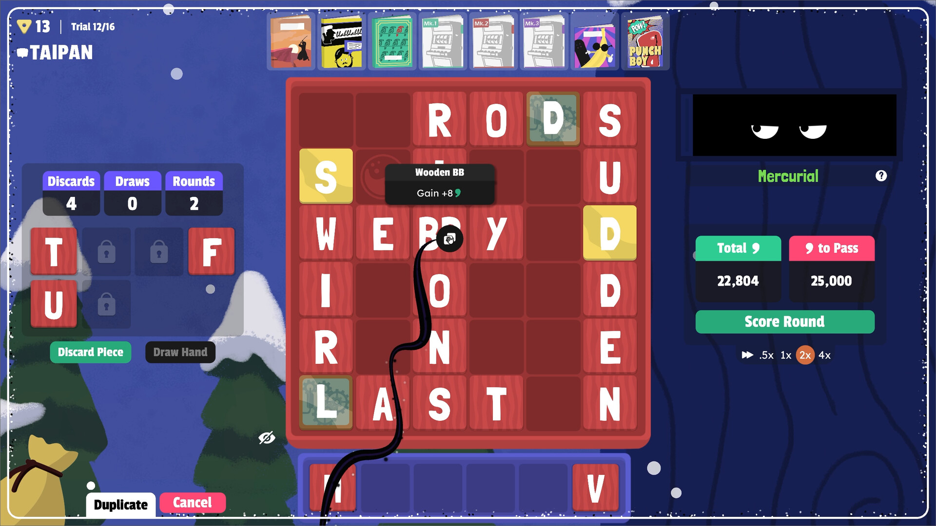Watchword is a roguelike deck builder about playing words to beat increasingly difficult trials with rule-breaking synergies and combos.