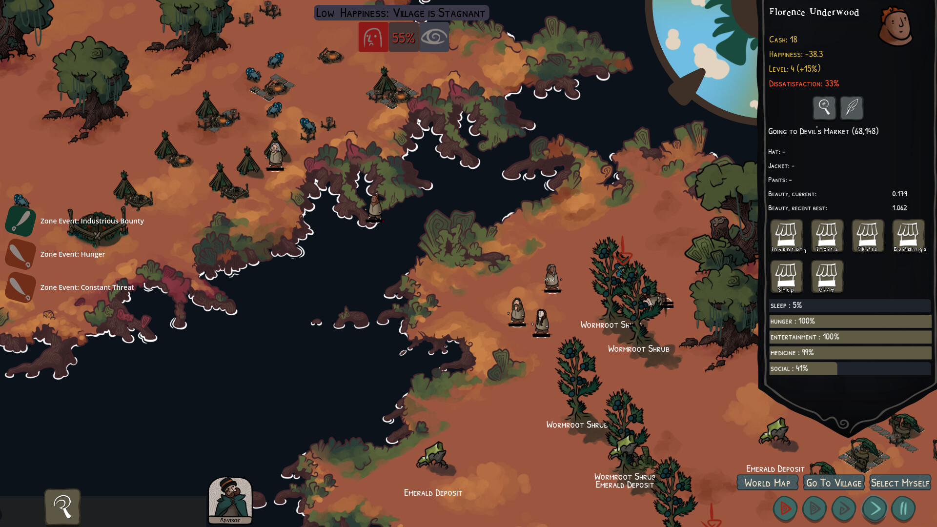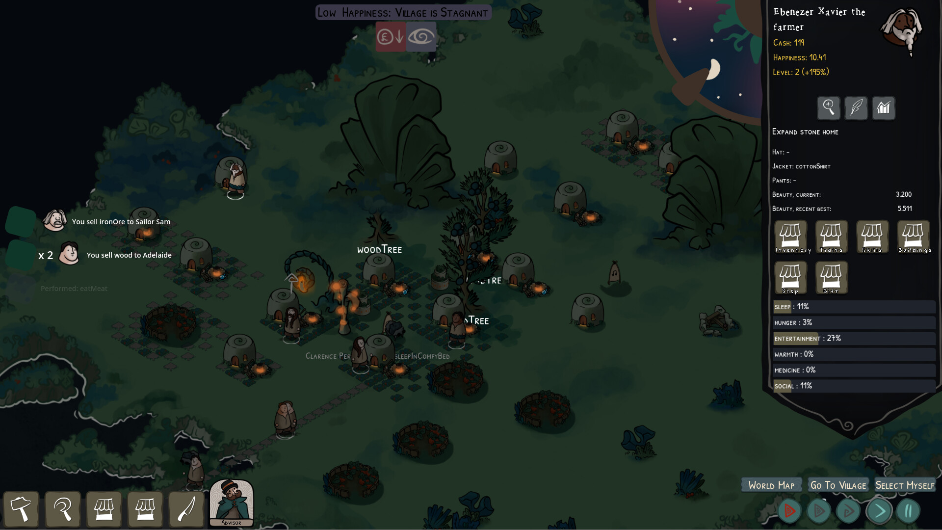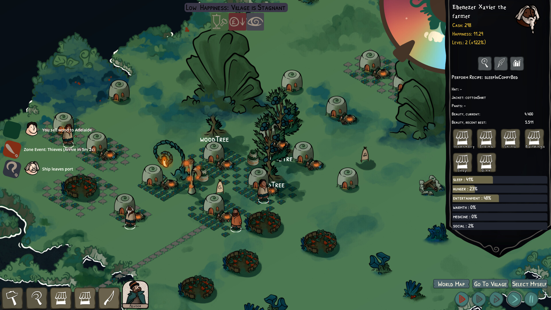 Mercantisle is living world village simulator, where the NPCs (both in your village and in their neighbouring NPC-run villages) lead their own lives. Your villagers all try to make a living for themselves, and neighbouring villages grow and trade over time. You live among them, adapting to their needs and the opportunities which they make available.