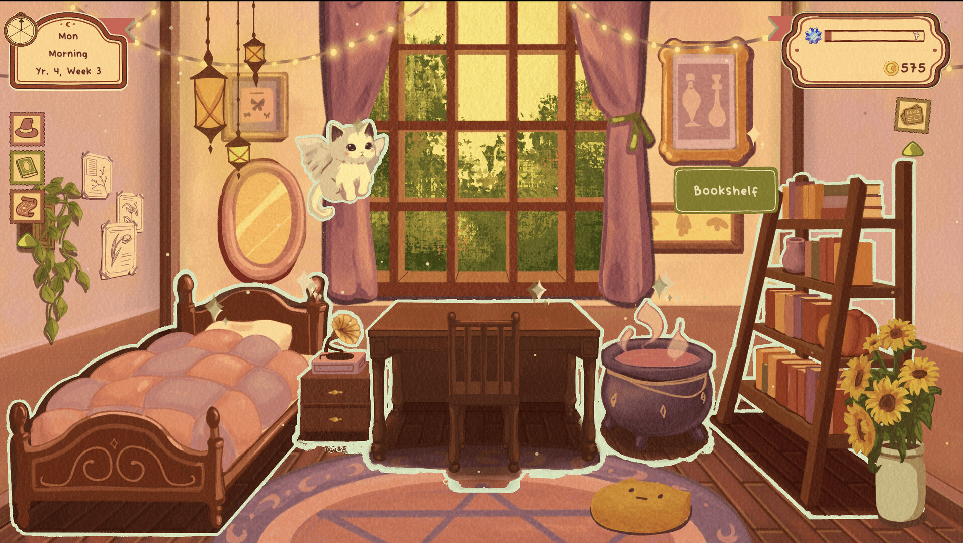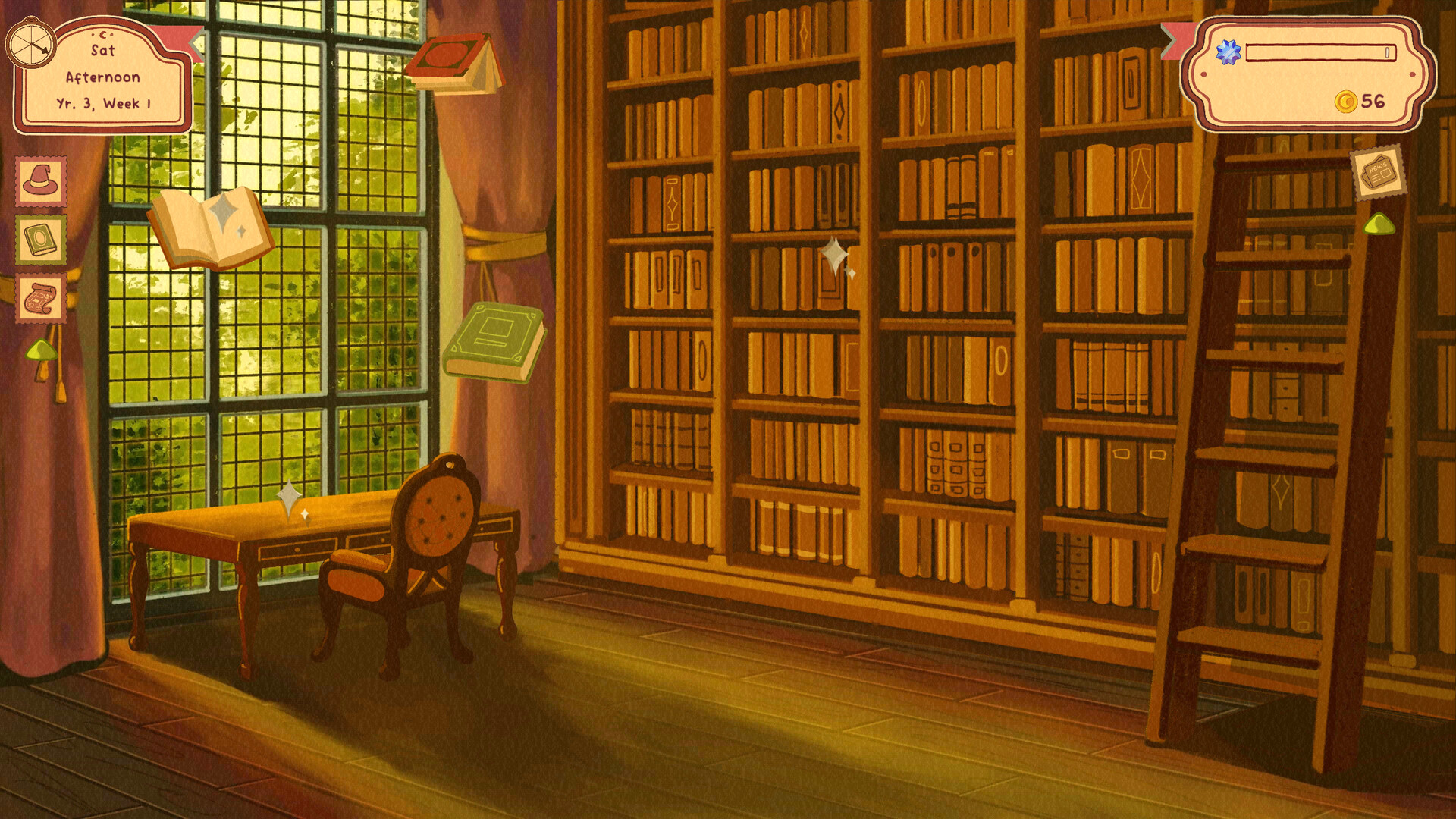 Your wages can be exchanged for a sweet treat in the dining hall, a new book downtown, or accessories for your dorm, including a record player and a cauldron. If you have a particular specialty–such as potion-making or painting–try selling your wares to fund future projects. As you work, however, be mindful of your energy level; you can take a rest in your dorm when needed.