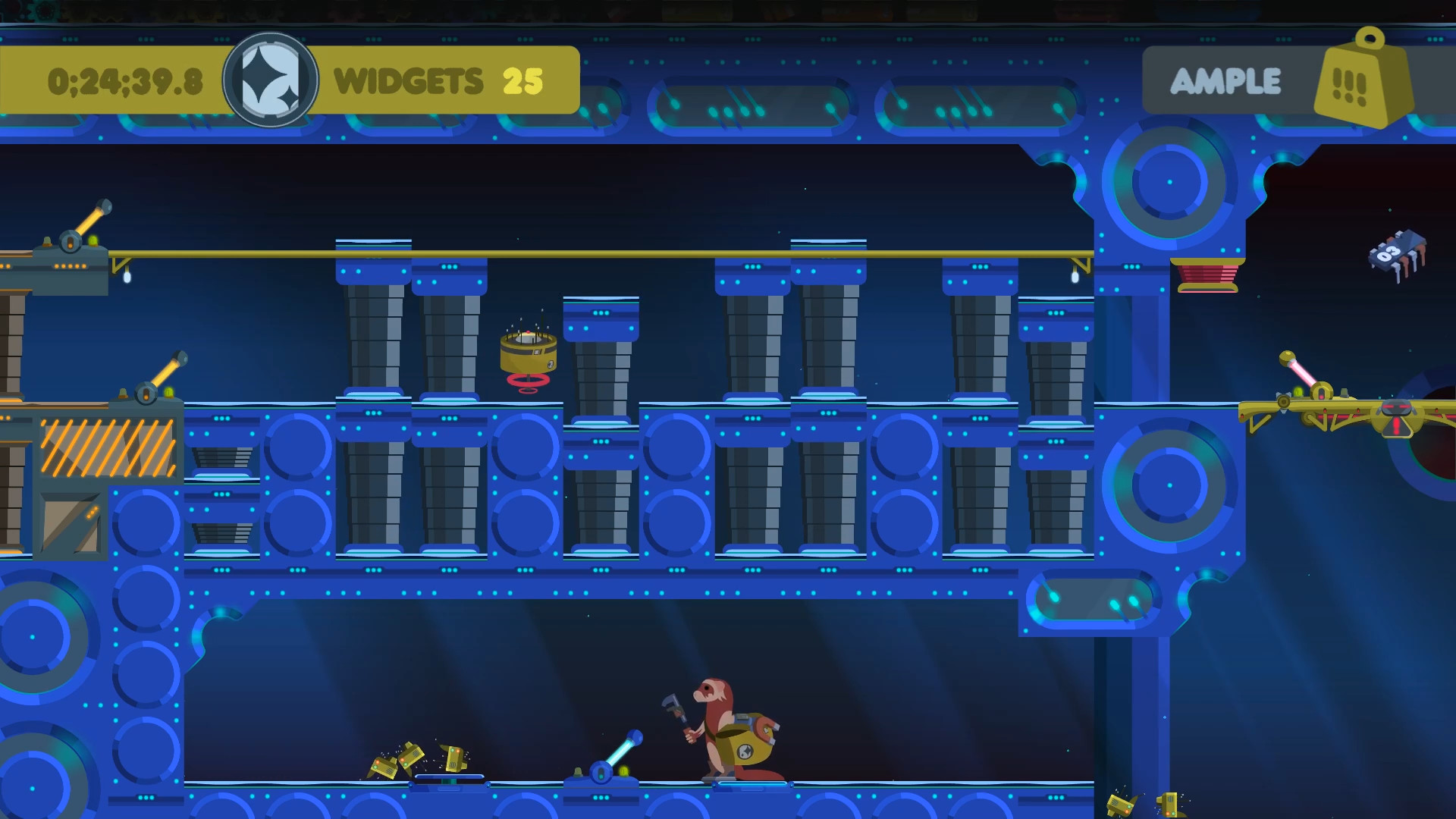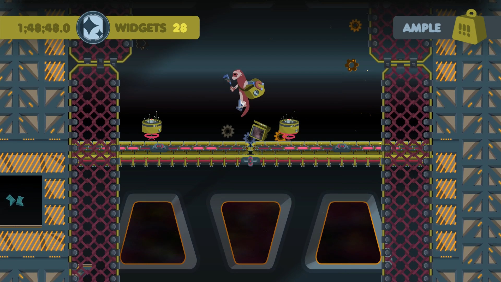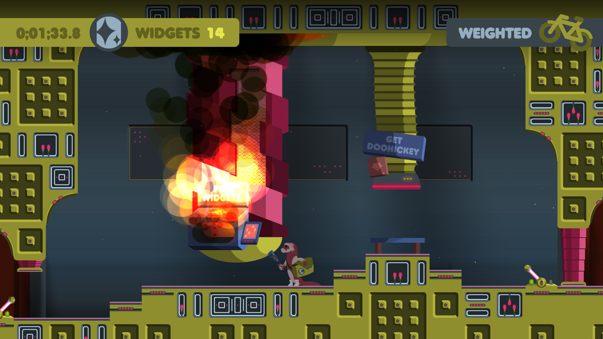 Widgets: you want them! But every widget you collect adds to the weight of your satchel, making it a little harder to reach the next platform or avoid the station’s maintenance bots. Levels can be relatively easy if you don't collect any Widgets, but they become a greater challenge as you fill Sprocket’s satchel.