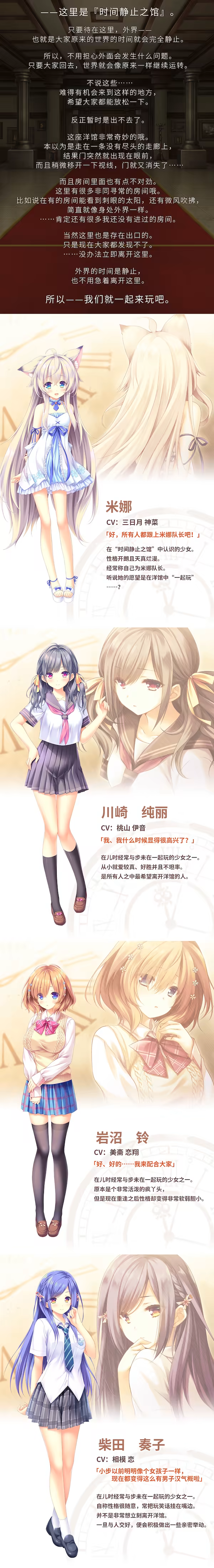 《真愿朦幻馆~在时间暂停的洋馆里追寻明天的羔羊们~》是由日本美少女游戏知名品牌Lump of Sugar(方糖社)于2022年6月24日发售的最新力作。本作由由人气画师萌木原文武担当原画与人物设计,由知名剧本家中岛大河创作剧本。片头主题歌《静寂之门》由新锐创作型歌手逢濑晶创作并献唱。