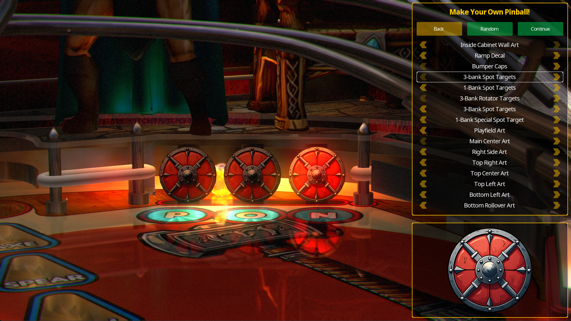 The Artwork Editor includes a pinball table with a viking theme that can be customized by your taste in some way. This pinball table has 16 different parts you can customize their arts, like the inner wall of the cabinet, the plastic entrance of the ramps, the plastic caps of the pop bumpers, spot targets, and the background and key elements of the playfield. Every customizable part has 5 different arts to select from. This way every time you play you can have a various visual experience. If you are not a person who likes to spend some time for customization, you have a possibility to randomize an art for the customizable parts.
