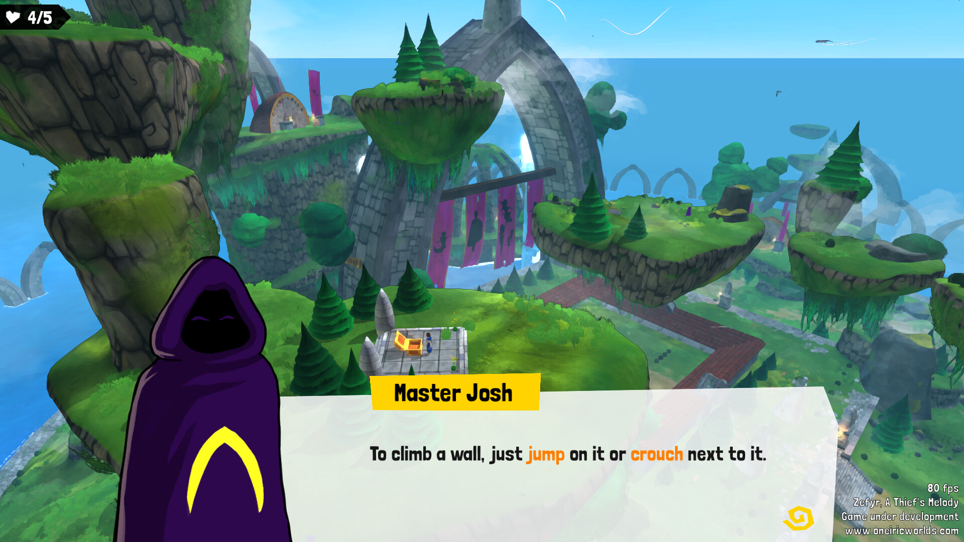 "Zefyr: A Thiefs' Melody" is a tribute to old adventure games like "Beyond Good & Evil" and "Zelda Windwaker"; it features exploration, dialogs, fights, puzzles, collectibles and huge Boss battles, all wrapped in a colorful world with a contemplative and feel-good atmosphere.